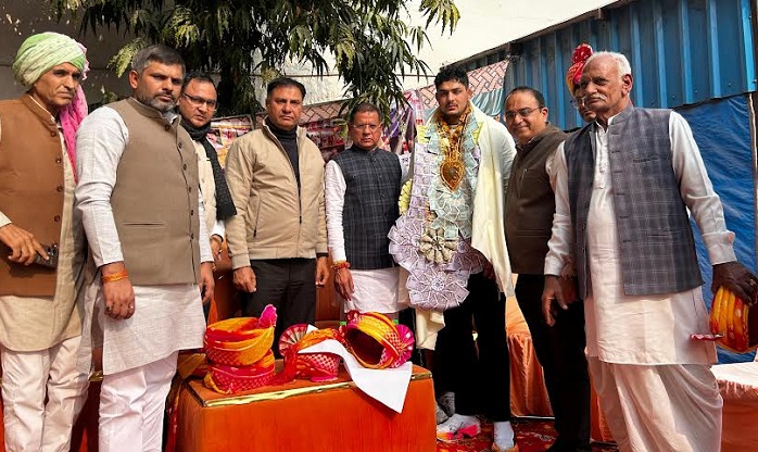 रिपोर्ट , अजय वर्मा / फरीदाबाद। हरियाणा के मंत्री राजेश नागर ने गांव नीमका में राजा जैत सिंह की प्रतिमा को और विशाल बनाने के लिए संचालन समिति को 17 लाख रुपए का चैक सौंपा। वह यहां गोल्ड मेडलिस्ट पहलवान शिवम नागर को आशीर्वाद देने के लिए आयोजित समारोह में पहुंचे थे। जिसमें बड़ी संख्या में सरदारी भी मौजूद थी। इस अवसर पर मंत्री राजेश नागर ने कहा कि राजा जैत सिंह का इतिहास हमारी आने वाली संतान को राष्ट्रभक्ति और सेवा का मार्ग दिखाएगा। इसके लिए राजा जैत सिंह स्टेडियम में महान राजा जैत सिंह की एक विशाल प्रतिमा लगाने का निर्णय पिछले दिनों सरदारी ने किया था। जिसको पूरा करते हुए आज मैं 17 लाख रुपए का चेक संचालन समिति को सौंप रहा हूं। मुझे उस दिन का इंतजार रहेगा जब यह समिति जल्द से जल्द राजा की विशाल प्रतिमा को लगाने और उस स्थल को सुंदर बनाने का काम पूरा करेगी। मंत्री राजेश नागर ने कहा कि शिवम नागर पहलवान ने थोड़ी ही उम्र में राष्ट्रीय स्तर पर मेडल जीतकर हमारे नीमका, तिगांव विधानसभा और हरियाणा का नाम रोशन किया है। मैं शिवम को आशीर्वाद देता हूं कि वह अंतरराष्ट्रीय स्तर पर भारत का नाम रोशन करें। नागर ने कहा कि हमारी हरियाणा की सरकार खेल और खिलाड़ियों को आगे बढ़ाने के लिए पूरा सहयोग कर रही है। इसके लिए हमारी मोदी सरकार ने भी खेलो इंडिया जैसे कार्यक्रमों का आयोजन किया है, जिसमें हरियाणा के खिलाड़ी चमक रहे हैं। उन्होंने कहा कि खिलाड़ियों को नगद पुरस्कार देने में हरियाणा पूरे देश में नंबर एक पर है। उन्होंने स्वैच्छिक कोष से शिवम नागर पहलवान को एक लाख रुपए की सहायता देने की भी घोषणा की। इस अवसर पर ओलंपिक चैंपियन जयप्रकाश पहलवान, निंदर पहलवान, मुखराम पहलवान, योगेंद्र कसाना, देबू पहलवान, कोच जयदीप पहलवान, चौधरी खड़क सिंह, पार्षद प्रदीप टोंगर, पार्षद संजीव सरपंच, अमन नागर, दयानंद नागर, गिरिराज डिप्टी डायरेक्टर खेल विभाग, समरेश चंदीला, हेमंत शर्मा प्रधान आईएमटी एसोसिएशन आदि प्रमुख रूप से मौजूद रहे।